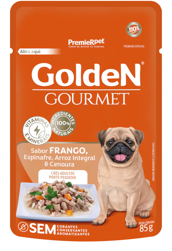 PremieR® Gourmet Cães Adultos Porte Pequeno – Frango e Arroz Integral é um alimento Super Premium que faz parte GoldeN® Gourmet Cães Adultos de Porte Pequeno Sabor Frango, Espinafre, Arroz Integral e Cenoura é um alimento Premium Especial que faz parte da linha GoldeN® Gourmet. Este produto é um alimento úmido completo indicado para cães adultos saudáveis e de porte pequeno.