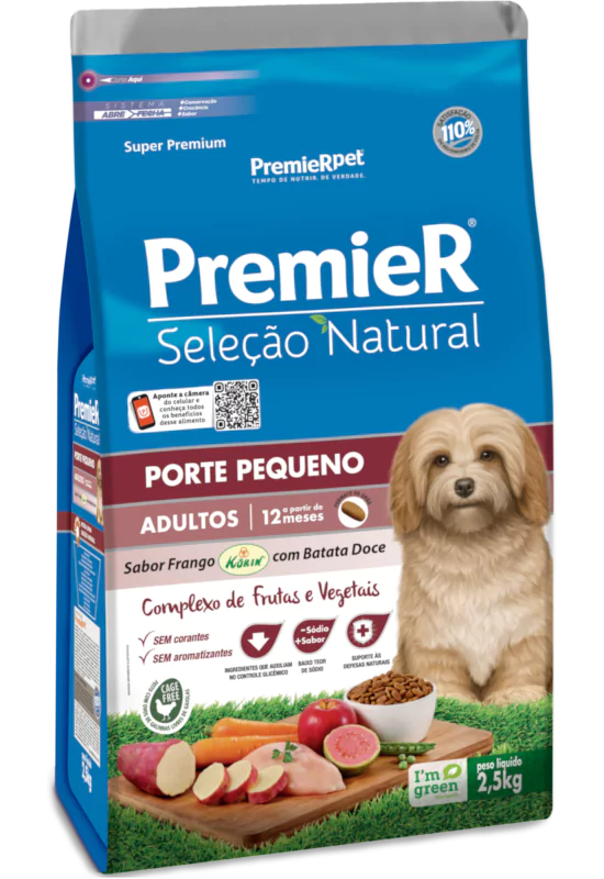 PremieR® Seleção Natural Batata Doce raças pequenas é mais uma inovação da PremieRpet®. Além de contar com a exclusiva fonte de proteína proveniente do frango Korin, possui na sua formulação a batata doce, que é um ingrediente que favorece o controle glicêmico, proporcionando uma vida saudável e mais equilibrada. Oferece também o complexo de frutas e vegetais, fontes naturais de fibras e sais minerais. E ainda, para manter o sabor natural dos ingredientes, contém baixo teor de sódio.